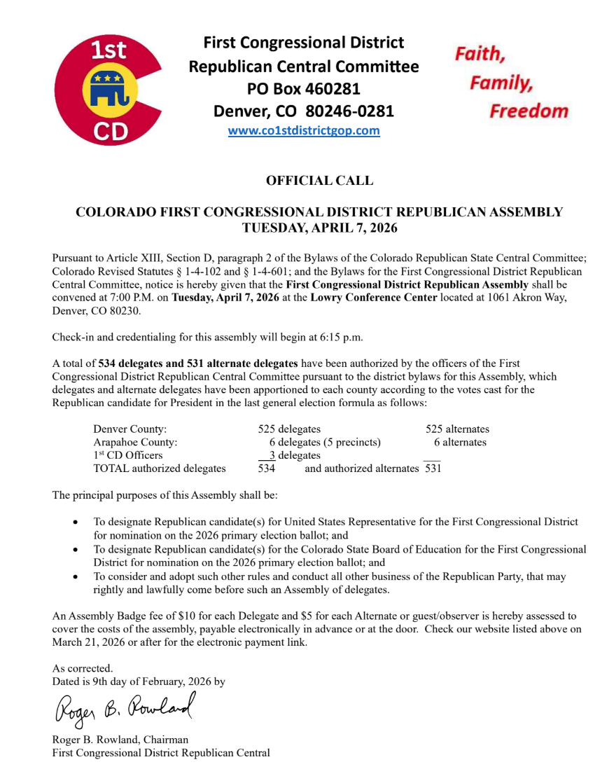 The First Congressional District Republican Assembly shall be convened at 7:00 P.M. on Tuesday, April 7, 2026 at the Lowry Conference Center located at 1061 Akron Way, Denver, CO 80230. Check-in and credentialing for this assembly will begin at 6:15 p.m.